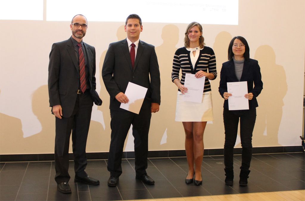 Herr Dr.-Ing. Speier gratulierte den diesjährigen Preisträgern Frau Jasmin Tkocz, B.Sc., Herrn Martin Niebuhr, M.Sc. und Frau Dr.-Ing. Xiangqin Liu.